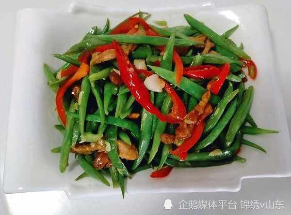 【食材】猪肉120克、扁豆150克、红干椒4个、盐适量、酱油1汤匙