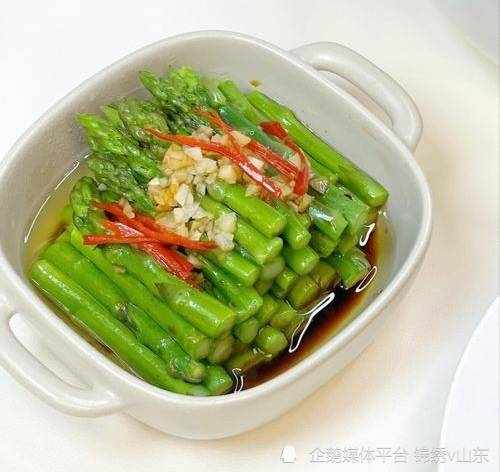 2.芦笋焯水,芦笋茎煮1分半左右,再放入芦笋头,煮1分钟左右。芦笋茎放在盘底,来点胡萝卜点缀一下,浇上蒸鱼豉油,放入葱丝和辣椒丝,然后浇上热油,一道简单美味的白灼芦笋就做好了。