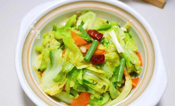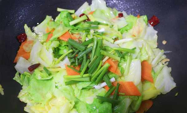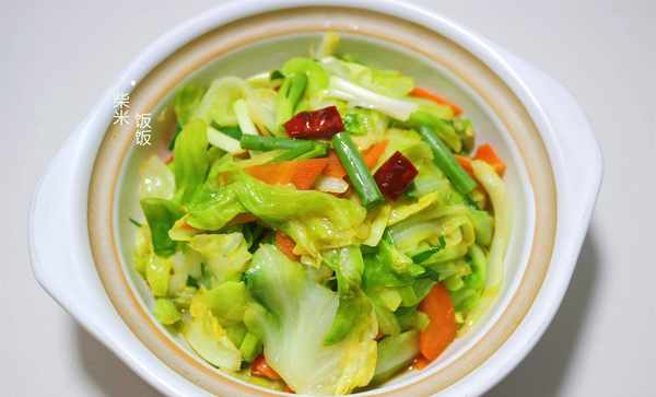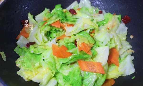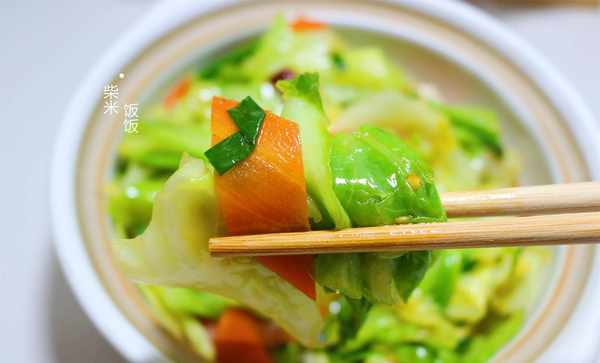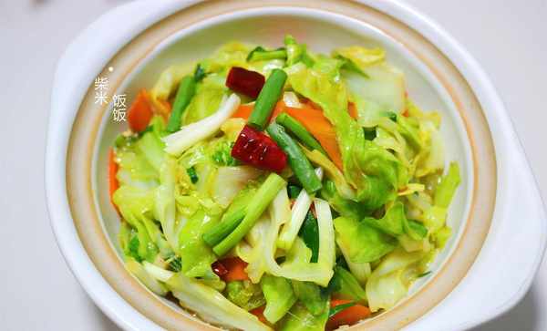 【食材】包菜、胡萝卜、香葱、蒜、干辣椒、盐、白糖、生抽、鸡精