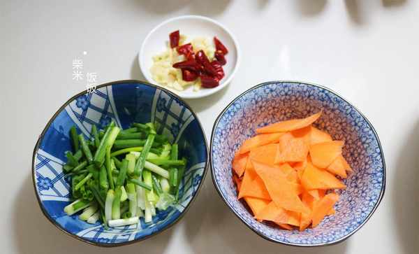 2,胡萝卜切成菱形片。香葱洗净,切段。大蒜切末,干辣椒切段。