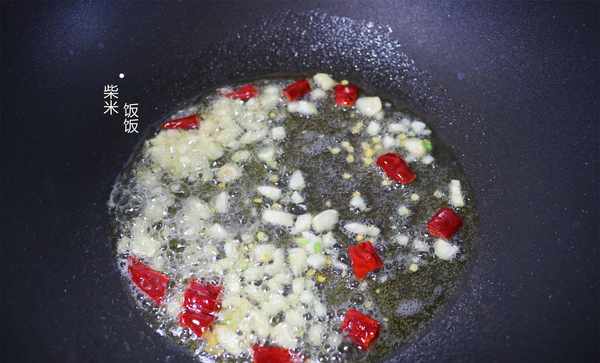 3,热锅凉油,倒入蒜末和干辣椒,大火炒出香味,炒至蒜末微微变黄。