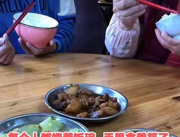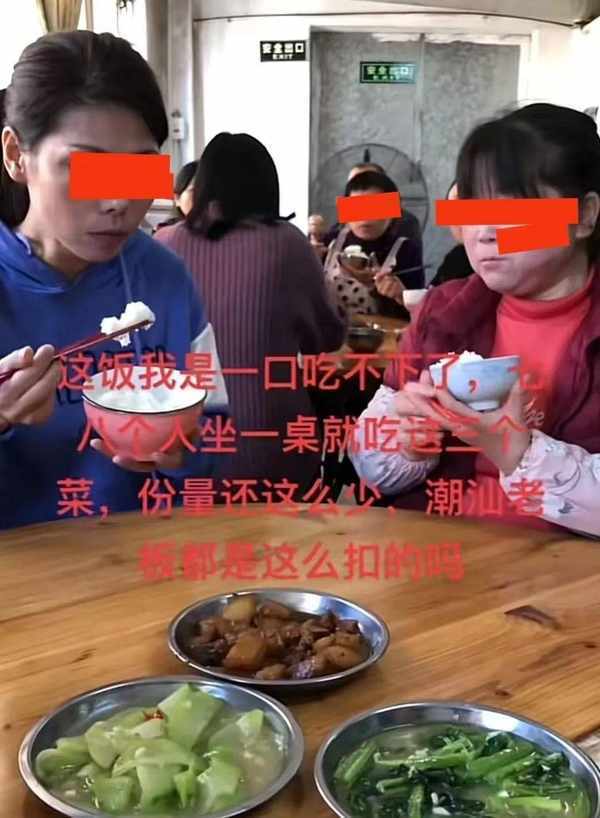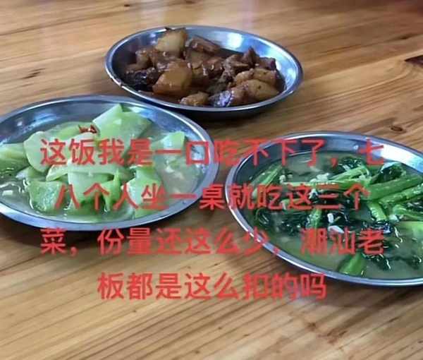 近日,广东潮州一家制衣厂的伙食,8个工人围坐成一桌,在一个偌大的饭桌上面摆着三碟菜,二碟青菜和一碟五花肉,这8个人每个人都端着饭碗,手里都拿着筷子,都不敢夹菜。