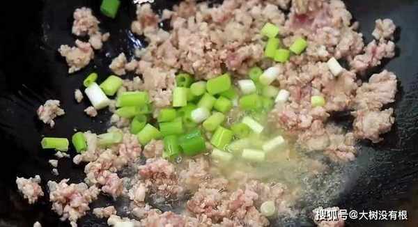 11、热锅,倒入肉末炒扁。