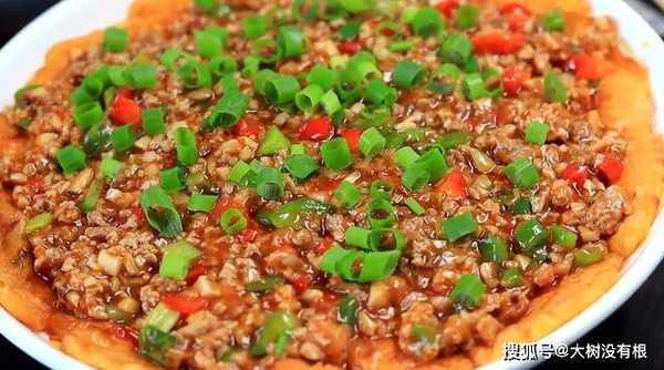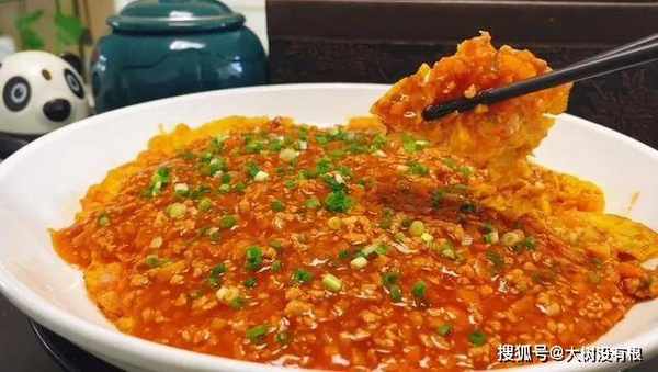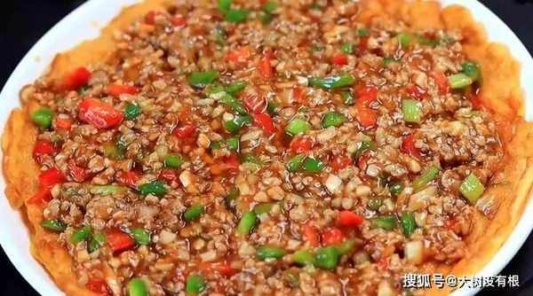 15、做好的肉末酱,放在做好的番茄蛋饼上,这道菜就完成了。