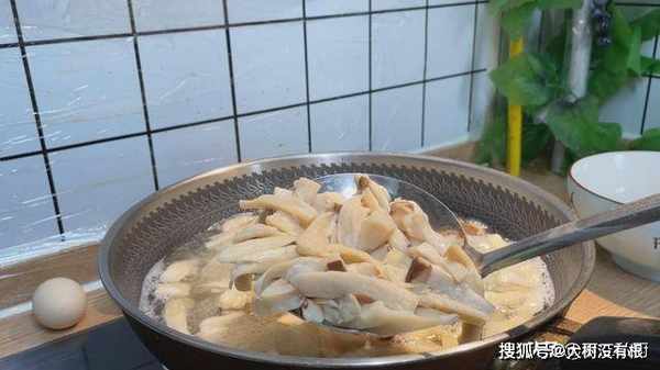 5、烧上一锅水,水开下入处理好的杏鲍菇,给杏鲍菇泡个热水澡,用漏勺搅动一下,水开之后再煮上五分钟左右,时间到了然后给它捞出来,放入到漏网中控控水,最好用漏勺按压一下,可以减少后面煸炒的时间。