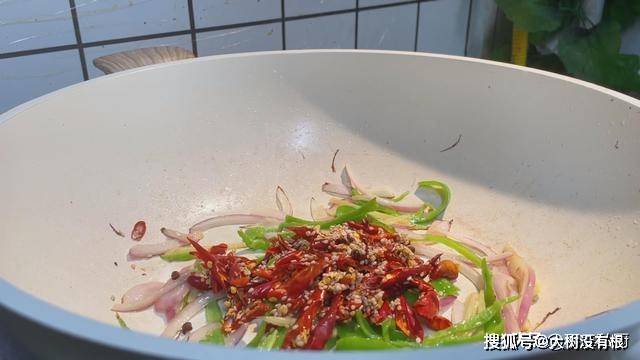 7、锅中再加入少量的油,加入螺丝椒丝和洋葱丝,用小火给它煸炒一下,把洋葱和螺丝椒的香气炒出来,然后加入干辣椒和芝麻,同样的煸炒一下,小火把干辣椒和芝麻的香味炒出来。
