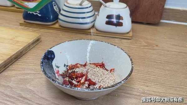 4、再准备点干辣椒,用剪刀剪成丝,我用的这个辣椒比较的香,不怎么辣,可以根据自己的口味选择,然后再加入一把,干花椒,再增加九百九十九粒白芝麻,增加一下香味。
