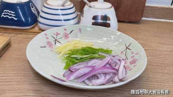 3、准备一块生姜,切成姜丝,适当的多切一点,再准备一个螺丝椒,也改刀切成丝,再准备一块洋葱,同样的切成丝,全部切好之后,放在盘中备用。