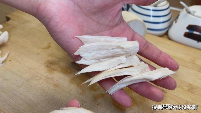 2、接着把杏鲍菇,用手撕成,一条一条的,这样用手撕的,比较容易入味,撕成这个样子就可以了,全部撕好以后,放入到一个大碗中。