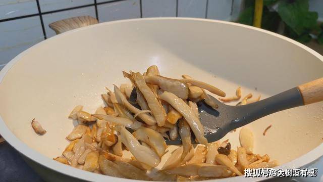 6、起锅烧油,加入比平时炒菜多一点的油,下入控干水分的杏鲍菇,用小铲子快速的翻炒,把杏鲍菇中水,炒出来,煸炒过程,火不要大,炒到,杏鲍菇的体积缩小,外表微微的焦黄,盛出到盘中备用。