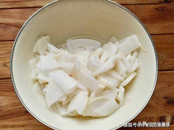 2、切成薄片,撒上一层食盐,抓拌均匀,腌制30分钟,这样做的目的是为了逼出里面的水分,萝卜吃起来没有苦味。