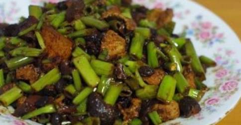 做法步骤:1准备材料。葱叶、葱白分别切丝。小红椒切丝。蒜切片。五花肉切小块。2油锅烧热,放入五花肉煎至金黄色。3放入蒜片、葱白炒香。4放入冰糖,炒至冰糖融化。5倒入豆豉,炒匀。6淋入米酒、老抽,炒匀。7倒入葱叶丝、红椒丝。炒匀。
