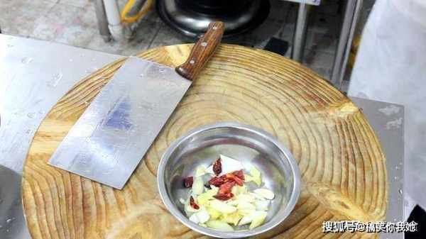 大葱白一段,斜切成片,生姜一块,切成菱形片,大蒜几粒,切成蒜片,加入几粒红干椒。