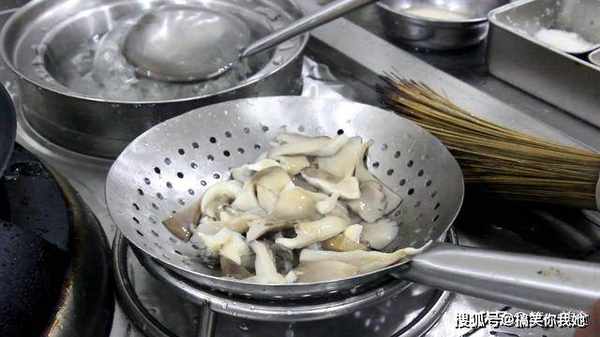 2.下面,我们把蘑菇焯一下水,锅内烧水,水开后,倒入蘑菇焯水1分钟,捞出后用清水冲洗,然后用手挤一下水分,焯过水的蘑菇,在烹饪过程中减少出水。