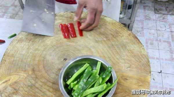 2.青圆椒一个,去籽后,切成宽条,红尖椒一个,去籽后,也切成宽条
