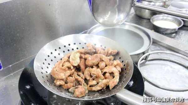 5.锅内烧油,在等油热的时间,沥干水分的肥肠,撒上干淀粉拌匀,这样炸出来的肥肠焦脆,油烧至7成热时倒入肥肠,炸30秒捞出。