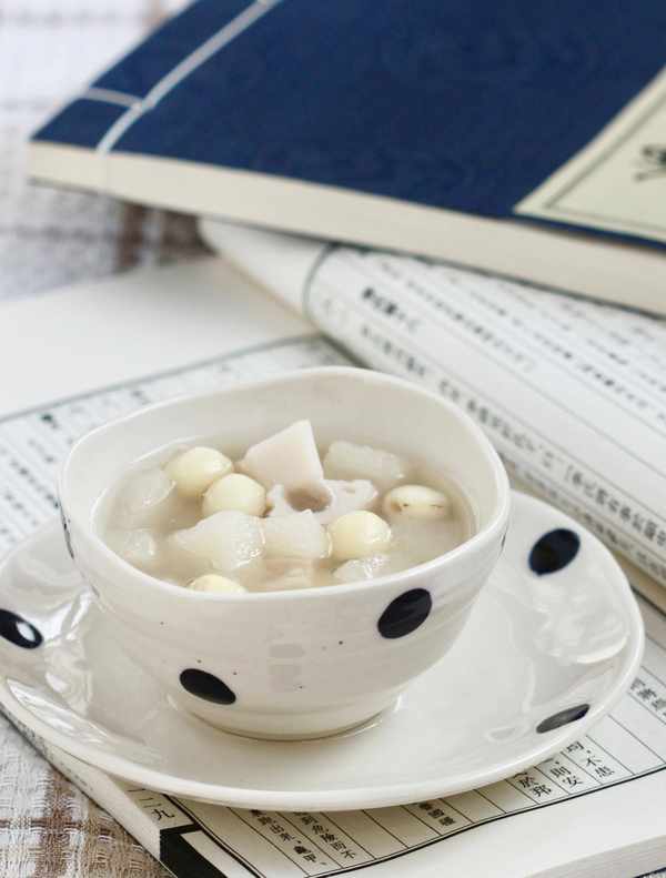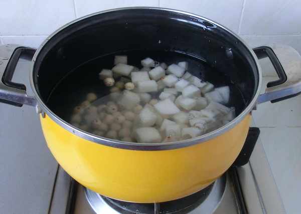 6、煮至莲藕、莲子、雪梨软烂,调入冰糖。