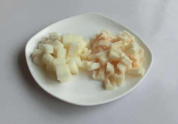 2、莲藕去皮,切丁,雪梨去皮,切丁。