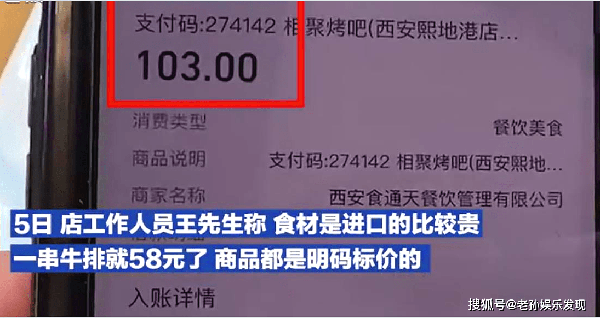 无独有偶,今天又有条“5串烤串收费103元”微博视频,冲上热搜榜。此事,近日发生在陕西西安。