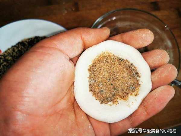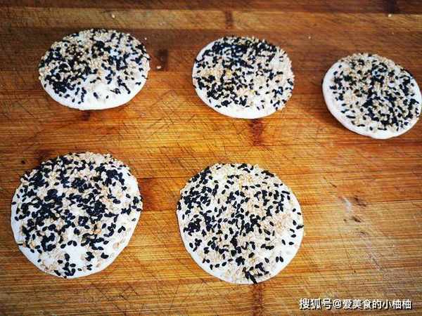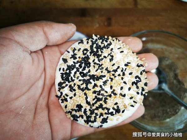 5、重新整理好,按扁,做成一个圆形的小饼,之后在饼的一面刷上清水,粘上黑白芝麻即可,这样一个饼胚就做好了。