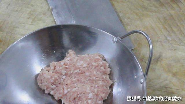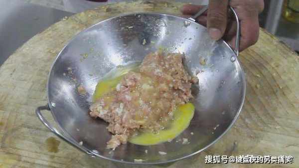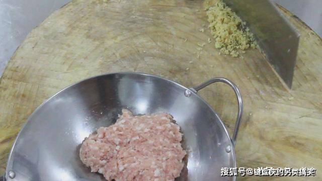 首先里脊肉一块,用娴熟的刀法,把它剁成肉末。