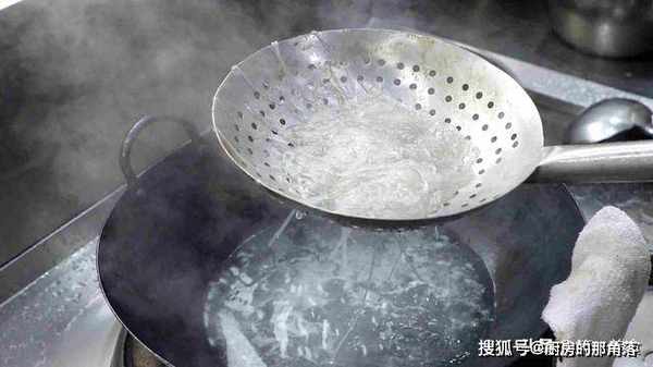 2.食材全部准备好以后,我们开始烹饪,锅内烧水大火把水烧开,放入准备好的米粉,烫10秒钟,米粉变成透明状时捞出控水。米粉烫的久了口感容易发糯没有弹力。