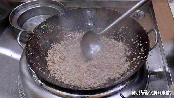 4.把肉末倒入锅中不停的翻炒,把肉末炒散,肉末炒散以后转大火继续翻炒,这一步是要炒出肉末中的水分,把肉末炒干炒香,肉末炒香炒成微黄色时盛出来备用。