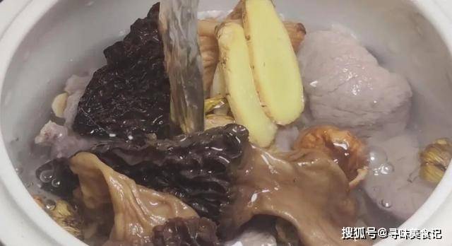 7.洗净的猪肉倒入炖盅中,再倒入洗净的汤料,2片姜片,以及没过食材的清水。