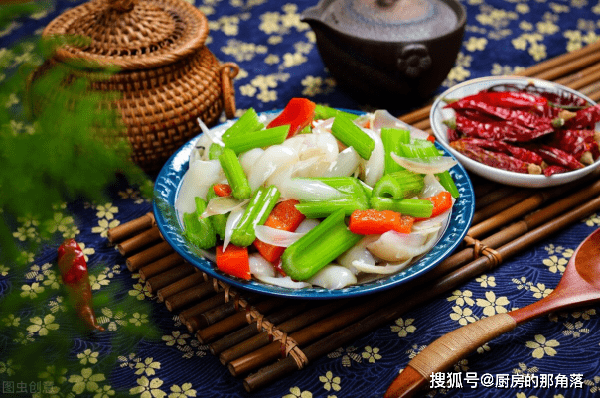 5、锅中加入一勺油,倒入红椒芹菜翻炒,倒入盐、鸡精、生抽调味