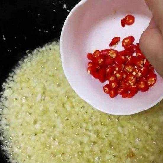 5、热锅倒入食用油,油温八成热,倒入大蒜煸出香味,再放入小米椒翻炒,再放入蚝油,海鲜酱油,盐,少许白糖,加少许的开水翻炒均匀后浇在粉丝上。