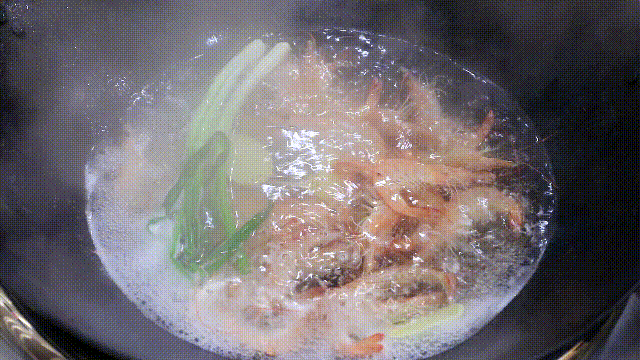 锅内烧水放入姜片和葱段,淋入一点料酒去腥,水烧开以后倒入大虾,大火煮至虾身变红。