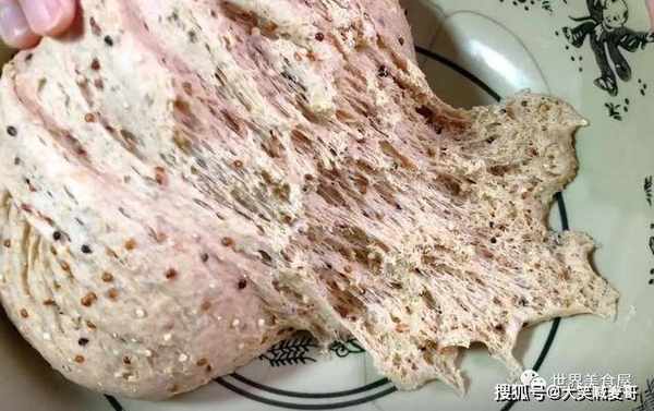 6、可以掰开面团中间,发现很多透气孔,发酵到这个程度就可以了。