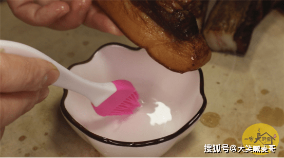 4、准备好的白酒,我们也要给他倒入小碗中,然后利用刷子将白酒在腊肉的表面,均匀涂抹上一层。