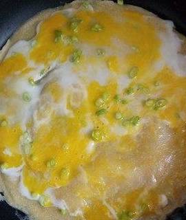 面糊快要定型的时候,磕一个鸡蛋上去,同样用刮刀摊匀,鸡蛋快要定型的时候,撒些葱花。