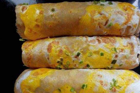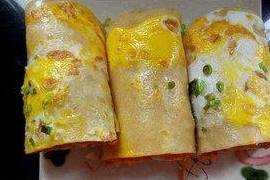 此时可以翻面,稍微加热,鸡蛋熟了就可以出锅了。找个平盘,没有鸡蛋的一面朝向自己。按照自己的口味刷酱,放榨菜,胡萝卜丝,火腿肠,油条段。合适的饼不会太干,卷起来不费事。鸡蛋一面在外,包裹起来会比较好看,有食欲。
