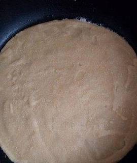 面粉跟玉米面加适量水,调成糊糊,糊要有一定的稠度,不能太稀,否则翻面会断裂。面粉比例可以增加,可以回忆一下小摊上见到的煎饼果子,糊糊稠到拉起来都有些费劲,这样省材料。当然自己吃,没必要调成小摊上那么稠。锅里刷薄薄一层油,挖一大勺面糊,用刮刀均匀摊开。第一张饼基本是要试试火,试试锅的温度和面糊的稠度。