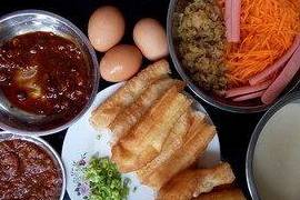 油条3根,涪陵乌江榨菜,胡萝卜丝,火腿肠,小香葱葱花适量