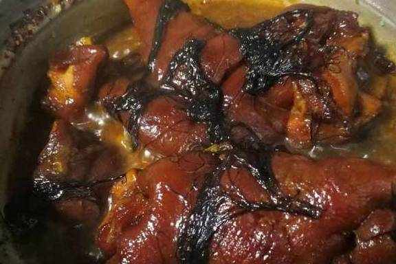 6、把调好料的猪手移到砂锅内,加入两勺炒好的豉油,加足量水慢炖一个半小时后加入泡好的发菜;