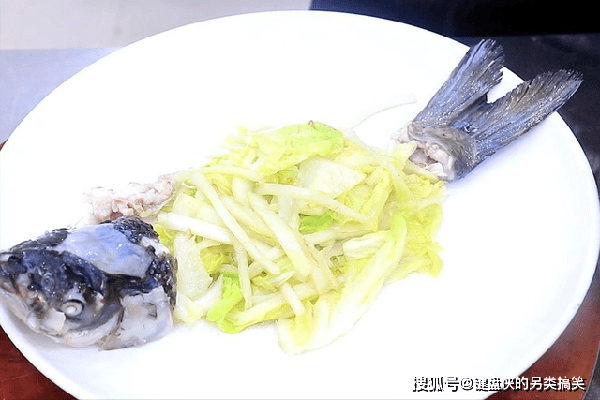锅内再烧油 ,大火翻炒至白菜帮断生,再放入白菜叶翻炒均匀,加入少许食盐,白菜叶微微塌软后往锅中多淋几次鱼汤,炒好以后盛放在盘中垫底,然后把鱼汤重新倒入锅中,加入食盐2克,胡椒粉2克,白糖少许提鲜,煮至鱼汤沸腾时放入鱼头和鱼尾,煮熟后捞出来摆盘。