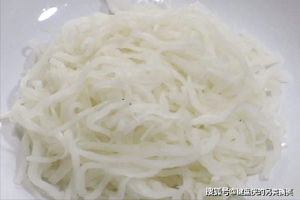 准备一根白萝卜,清洗干净后去皮,然后先切成薄片,再改刀切成细丝放入盆中。