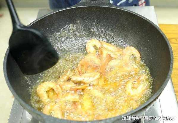 把腌好的大虾倒出来,用棉布或者吸水纸吸干上面的料汁,以免炸制时炸锅。锅内烧油,油温五成热时放入大虾,开中小火炸制,把大虾炸至金黄香酥捞出来控油。