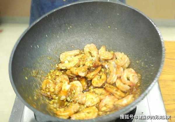锅内再烧油,放入葱姜蒜末爆香,倒入大虾颠锅翻炒,让虾吸收料头的香味,倒入调好的料汁,翻炒至料汁差不多收干就可以了。