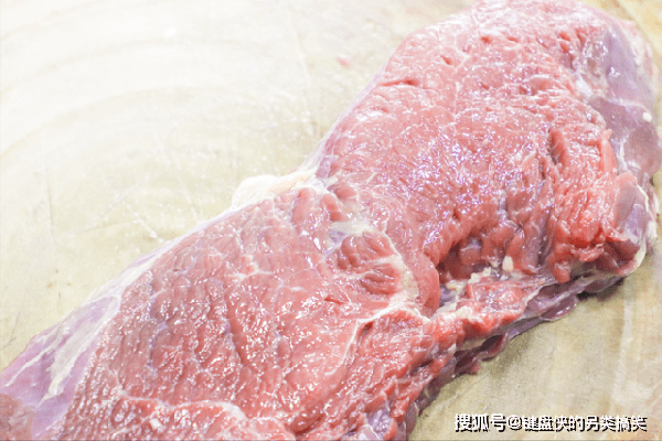 ,去除白色的筋膜,顶着牛肉的纹理把牛肉切成均匀薄片,这样吃起来更加滑嫩。