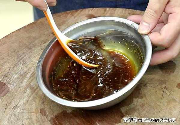 碗中放入两勺生抽,一勺蚝油,少许食盐,适量的白胡椒粉、黑胡椒粒、鸡粉搅拌一下,再淋入三勺料酒,搅匀备用。