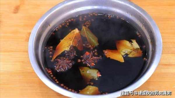 接着,我们准备腌料。碗中放入几片香叶,两粒八角,一小撮花椒,倒入260毫升生抽,再倒入清水稀释一下。再加一勺白糖提鲜,不喜欢的也可以不放,