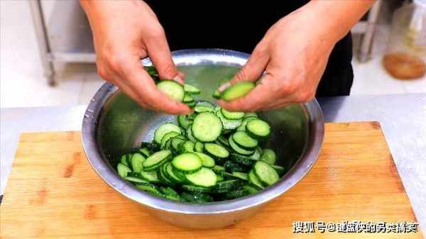 首先,准备几根黄瓜,洗干净以后,切成均匀薄片放入盆中。多加一些食盐,用手抓匀腌制30分钟。