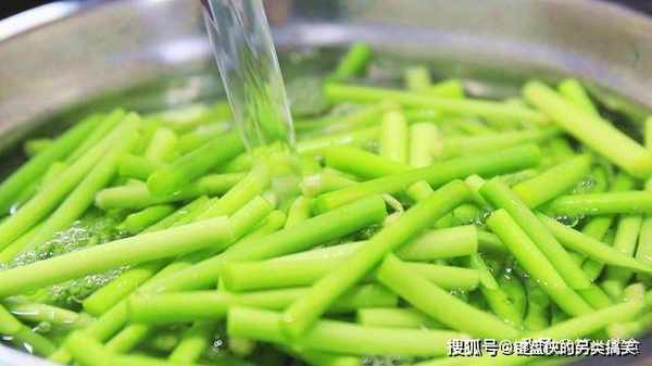 水烧开以后放入蒜苔 ,大火煮一分钟,蒜苔断生变软以后捞出来,过凉。