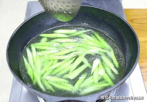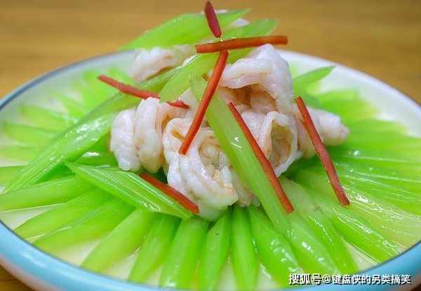 3.锅内烧水,加入少许食盐和植物油,把芹菜段倒进去快速焯煮一下,大约20秒钟,芹菜返青以后立即捞出,快速用凉水清洗几下,保持清脆的口感。