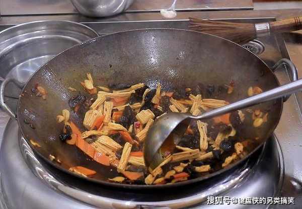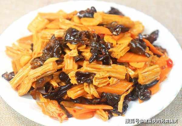 2.锅内烧水,油烧热以后倒入蒜片翻炒一会儿,蒜片炒香、炒成金黄色时加入一勺豆瓣酱炒出里面的红油,把胡萝卜倒入锅中翻炒几下,倒入腐竹和木耳。
