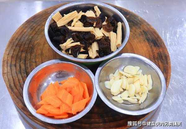 1.准备一小把木耳,用清水泡发,泡发以后清洗干净;胡萝卜一根,削过皮后切成菱形片放入清水中洗干净;腐竹已经提前泡软了,放在清水中洗干净备用;切点蒜片。